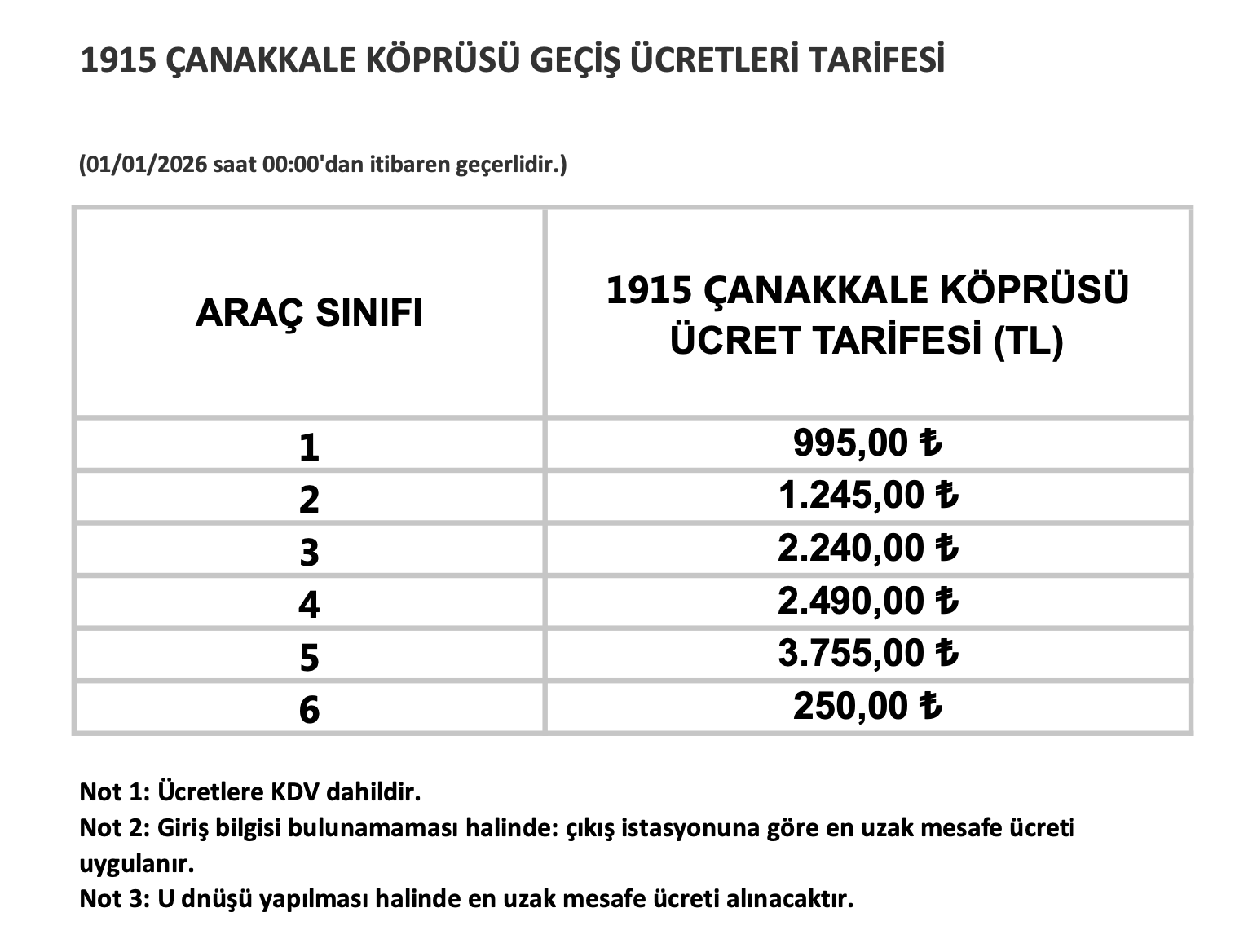 Karayolları Genel Müdürlüğü (KGM), köprü ve otoyol ücretlerinin zamlı halini yayınladı. 1 Ocak 2026 tarihinden itibaren geçerli olacak tarife kapsamında 1915 Çanakkale Köprüsü’nün geçiş ücreti 795 liradan, 995 liraya yükseltildi.