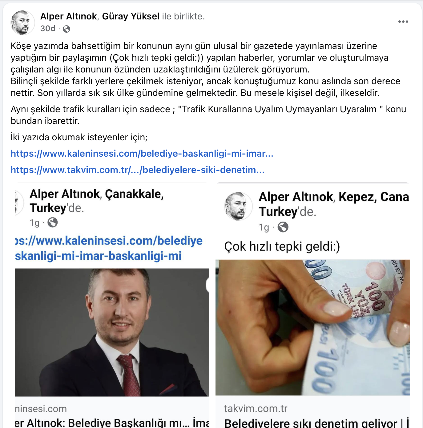 “Köşe yazımda bahsettiğim bir konunun aynı gün ulusal bir gazetede yayınlaması üzerine yaptığım bir paylaşımın (Çok hızlı tepki geldi:)) yapılan haberler, yorumlar ve oluşturulmaya çalışılan algı ile konunun özünden uzaklaştırıldığını üzülerek görüyorum.
