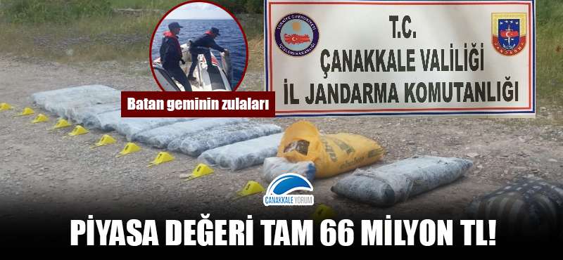 Çanakkale ve Balıkesir İl Jandarma Komutanlıkları ile Sahil Güvenlik Komutanlığınca yapılan çalışmalar neticesinde toplam 1326 kilogram ağırlığında piyasa değeri 66 milyon 300 bin TL olan uyuşturucu madde ele geçirildi.