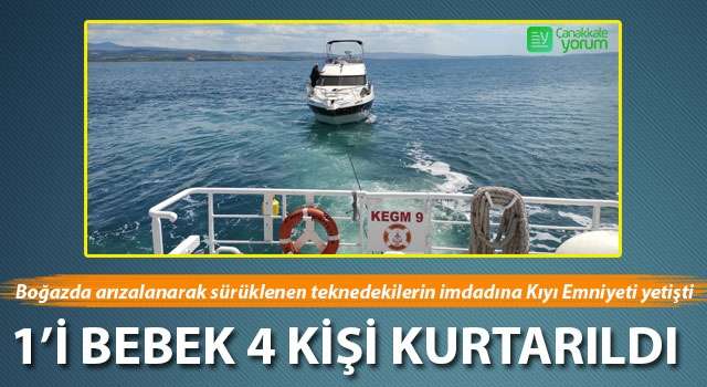 Çanakkale Boğazı'nda arızalanan bir tekne, Kıyı Emniyeti Genel Müdürlüğü 'KEGM-9' hızlı tahlisiye botu ile rıhtıma yanaştırıldı. Tekne içerisinde bulunan 1'i bebek 4 kişi güvenle tahliye edildi.