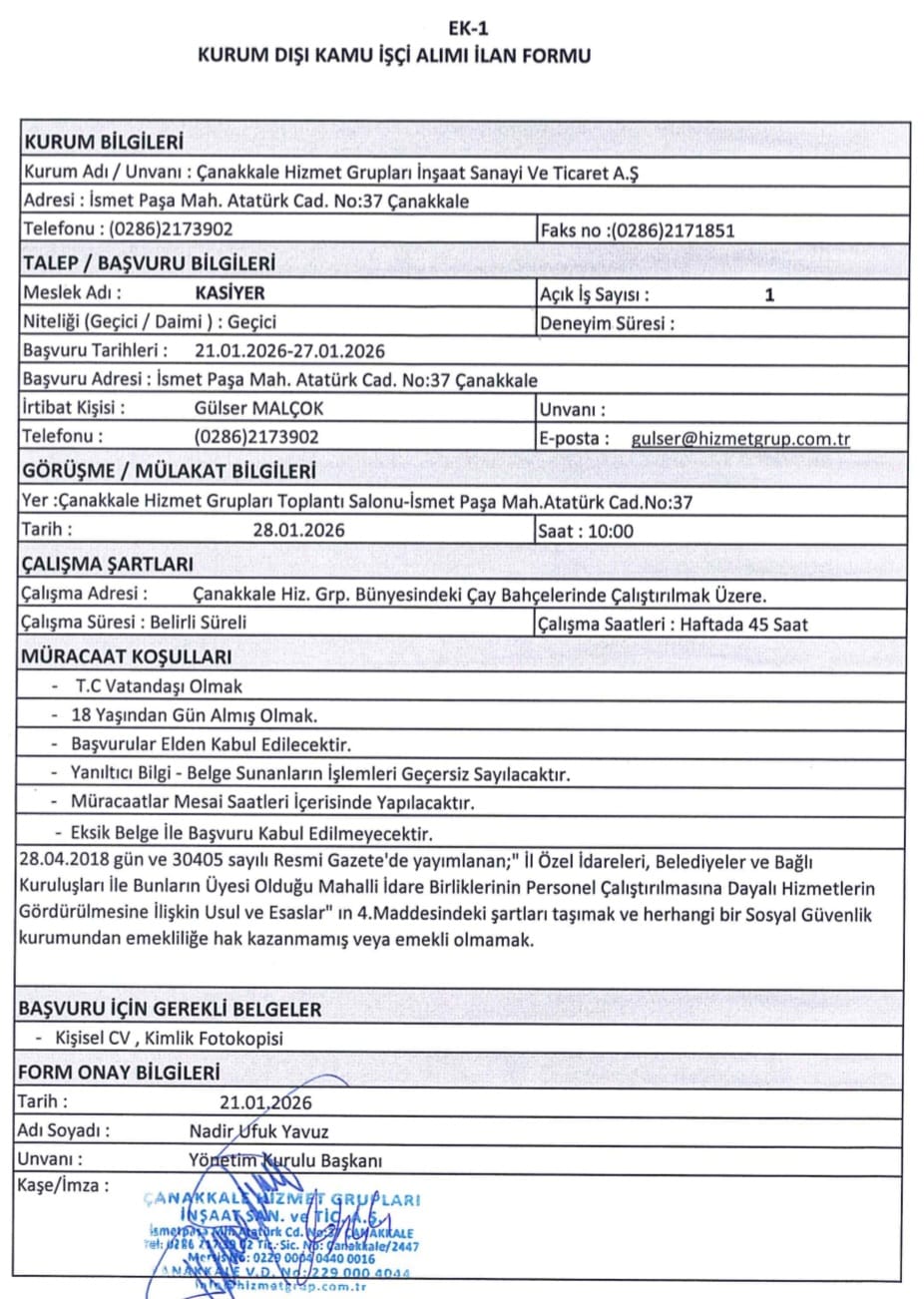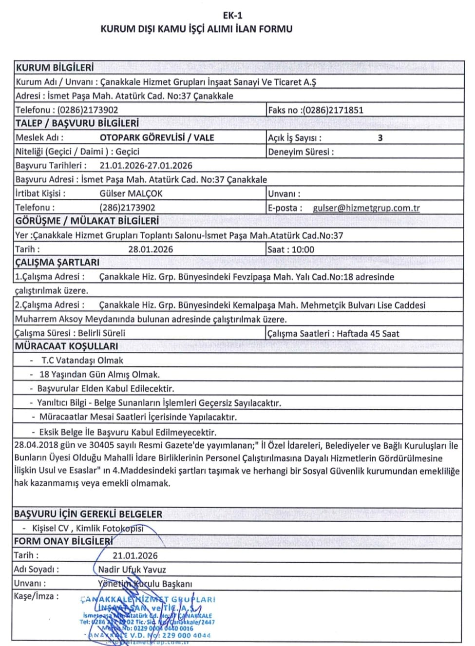 Çanakkale Belediyesi, İŞKUR aracılığıyla 3’ü otopark görevlisi, 1’i kasiyer olmak üzere toplam 4 işçi alımı yapılacak. Mülakat usulü yapılacak alımlar için son başvuru tarihi 27 Ocak Salı (yarın) olacak.