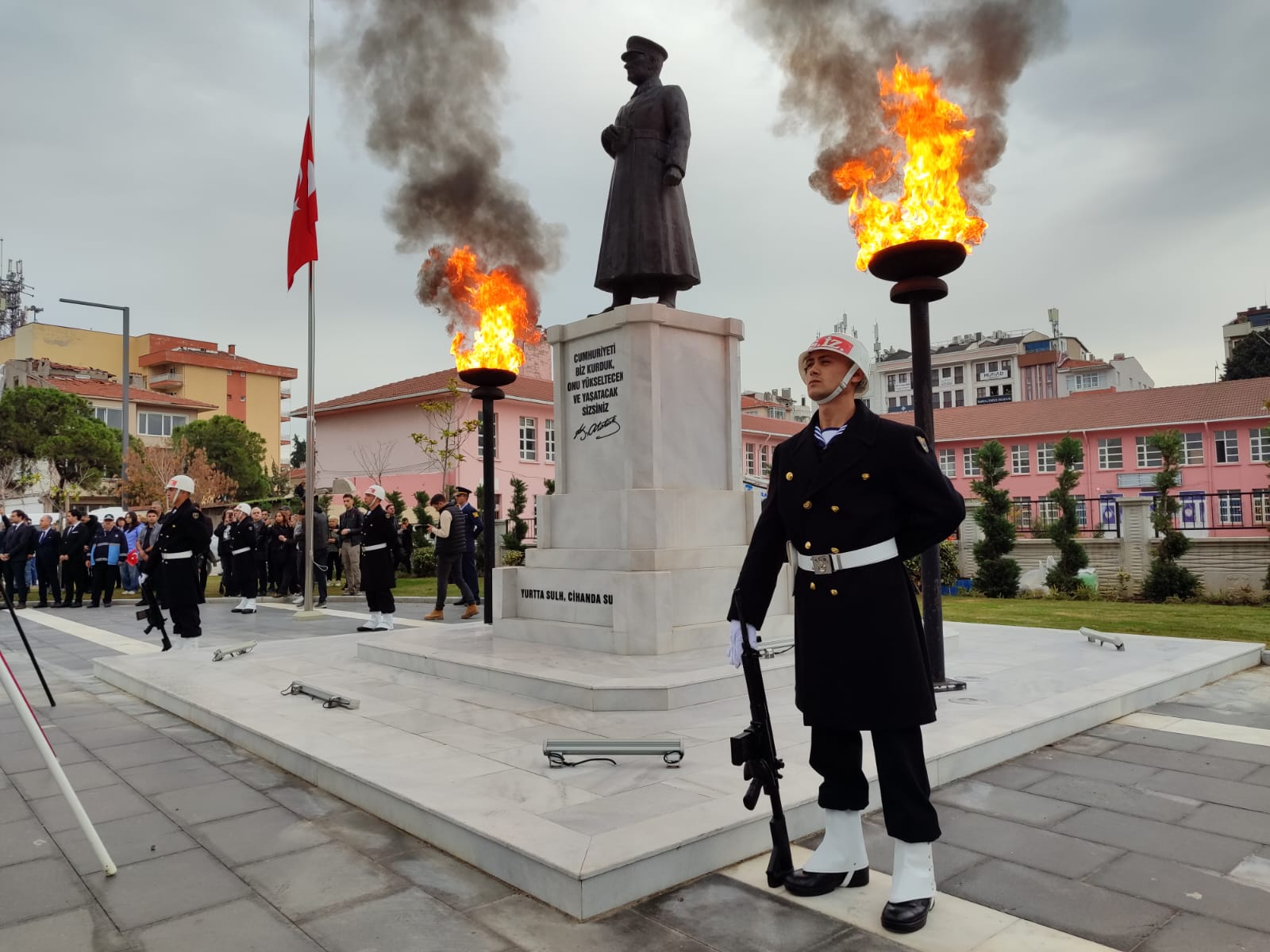 Saygı duruşu sonrası okunan İstiklal Marşı’nın ardından tören sona ererken Atatürk Anıtı’na çiçekler bırakıldı.