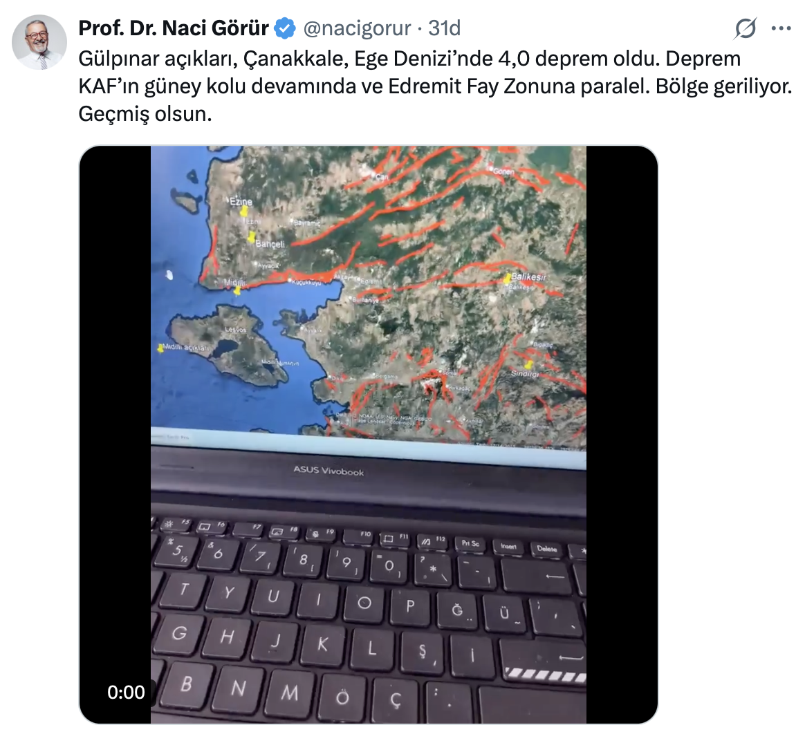 “Gülpınar açıkları, Çanakkale, Ege Denizi’nde 4,0 deprem oldu. Deprem KAF’ın güney kolu devamında ve Edremit Fay Zonuna paralel. Bölge geriliyor. Geçmiş olsun.”