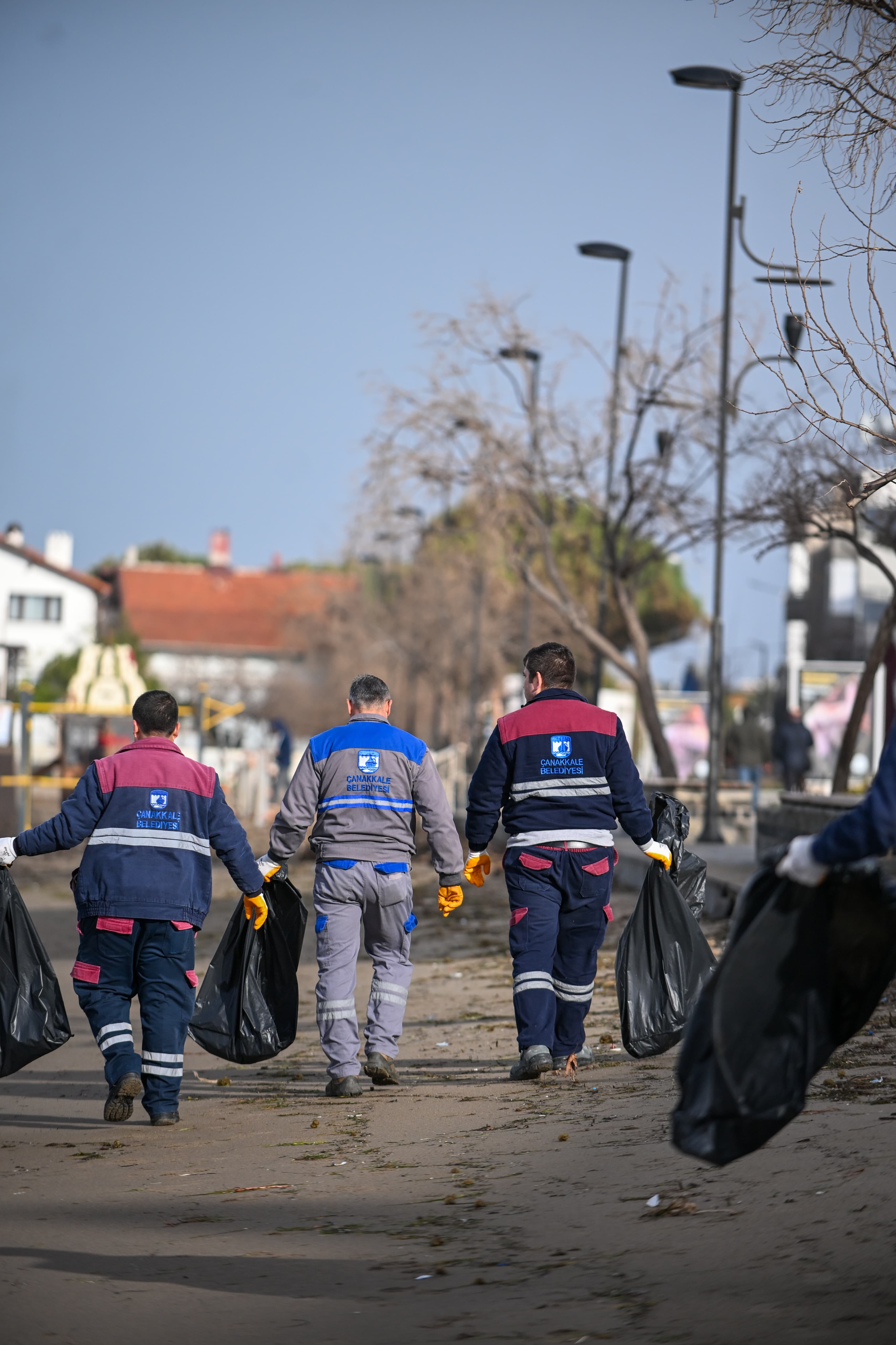 Çanakkale’de dünü (pazar) adeta kâbusa çeviren fırtına sonrası belediye ekipleri yeni kordon sahilinde temizlik çalışması yaptı.