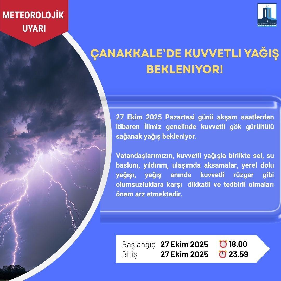 Çanakkale Valiliği, il geneli için akşam saatlerinden itibaren kuvvetli yağış uyarısı yaptı.
