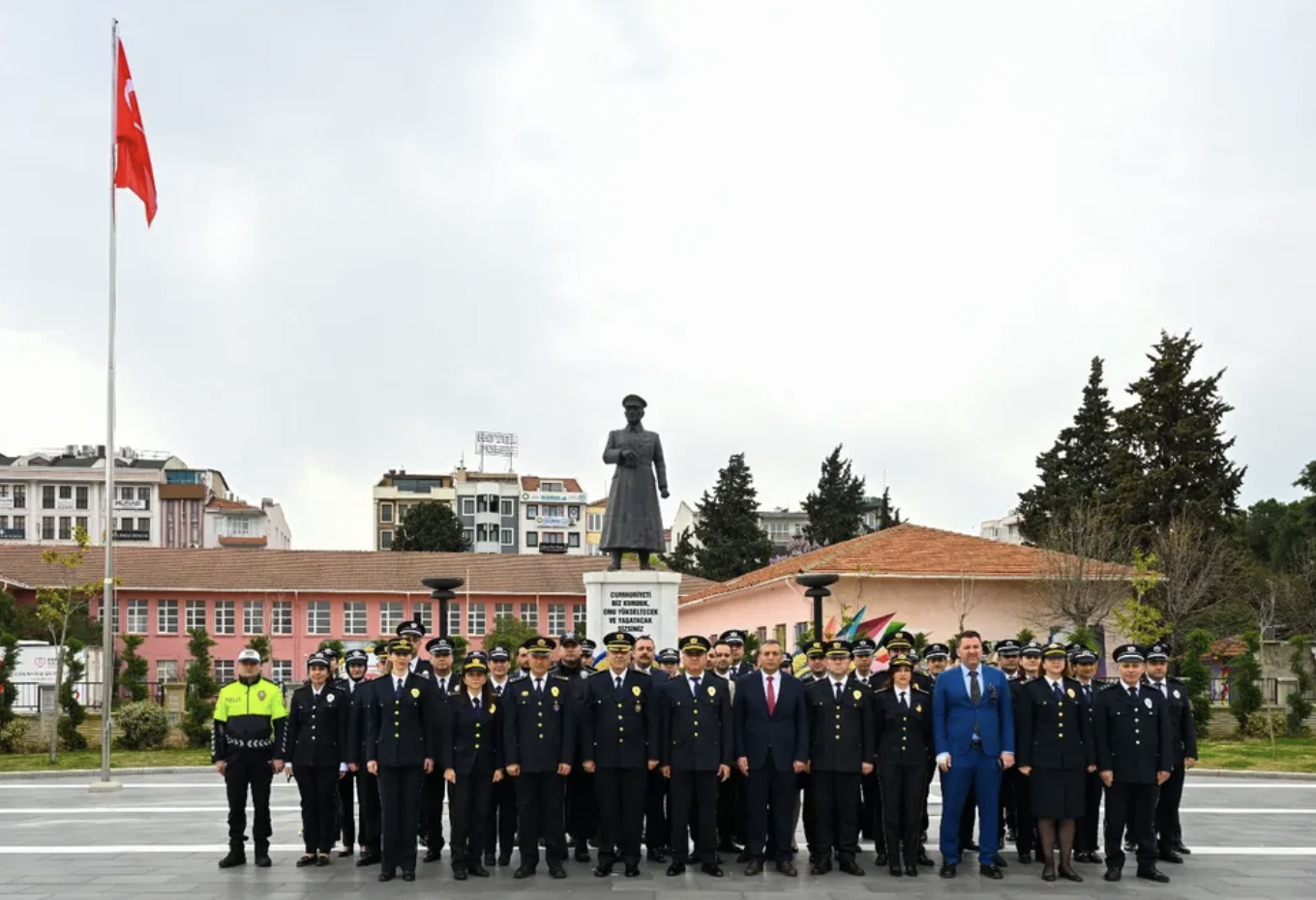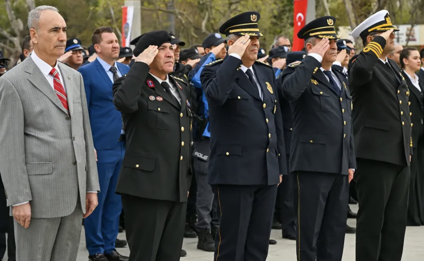 Cumhuriyet Meydanı’nda gerçekleştirilen törende, Çanakkale İl Emniyet Müdürlüğü, Çanakkale Deniz Polis Eğitim Merkezi Müdürlüğü, Polis Emeklileri Derneği çelenklerinin sunulmasının ardından, Cumhuriyetin kurucusu Ulu Önder Gazi Mustafa Kemal Atatürk ve silah arkadaşları ile tüm kahramanlar için saygı duruşunda bulunularak İstiklal Marşı okundu.
