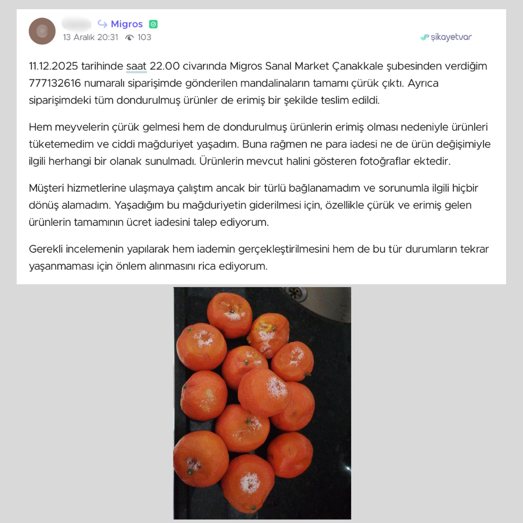 “11.12.2025 tarihinde saat 22.00 civarında Migros Sanal Market Çanakkale şubesinden verdiğim 777132616 numaralı siparişimde gönderilen mandalinaların tamamı çürük çıktı. Ayrıca siparişimdeki tüm dondurulmuş ürünler de erimiş bir şekilde teslim edildi.