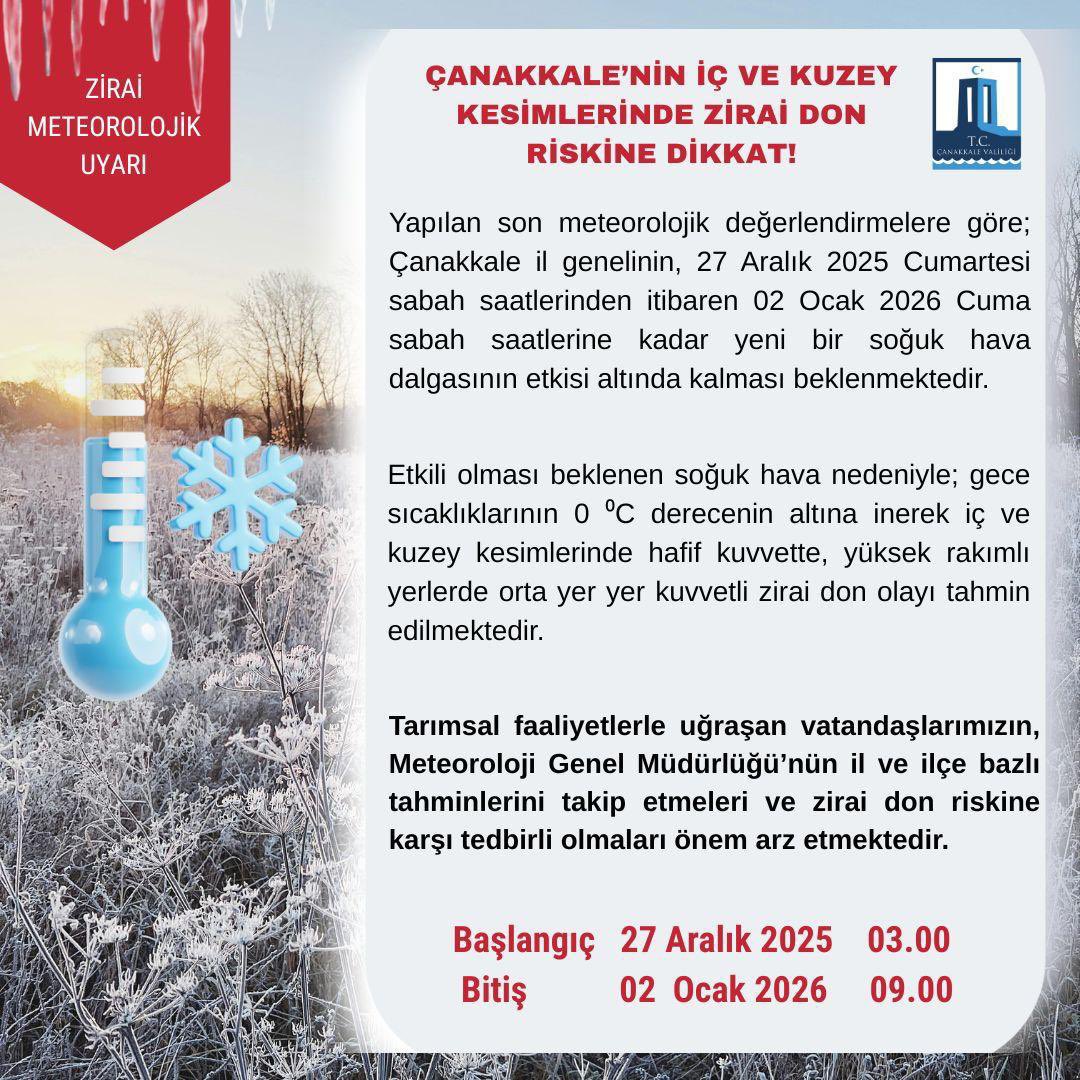 Çanakkale Valiliği, 27 Aralık 2025-2 Ocak 2026 tarihleri arasında il genelinde zira don beklendiği uyarısında bulundu.