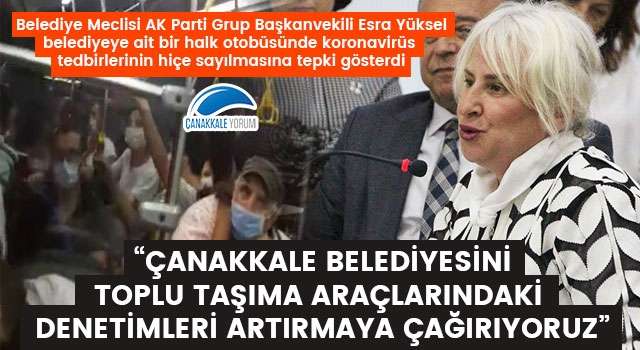 Belediye Meclisi AK Parti Grup Başkanvekili Esra Yüksel, Çanakkale Belediyesine ait bir halk otobüsünde koronavirüs tedbirlerinin hiçe sayılmasına tepki gösterdi. Uzmanların koronavirüsün en kolay toplu taşıma araçlarında bulaştığı yönündeki uyarısını hatırlatan Yüksel, “Çanakkale Belediyesini bu çok önemli konudaki disiplini sağlamaya, kararları uygulamaya ve denetimleri artırmaya çağırıyoruz” dedi.