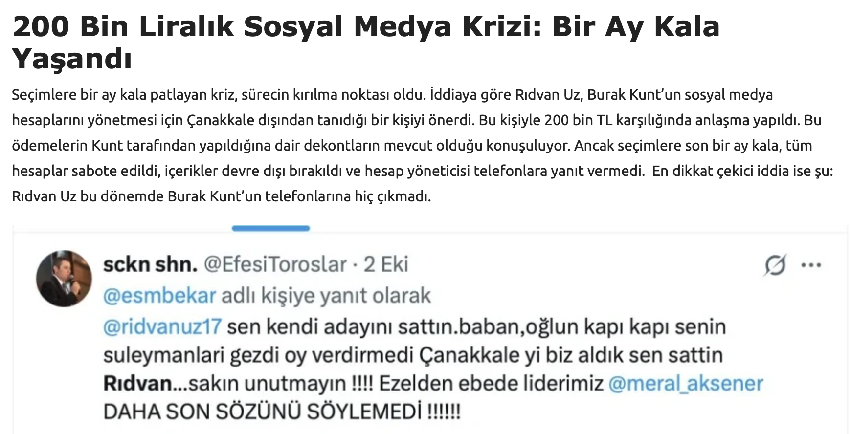 “Seçimlere bir ay kala patlayan kriz, sürecin kırılma noktası oldu. İddiaya göre Rıdvan Uz, Burak Kunt’un sosyal medya hesaplarını yönetmesi için Çanakkale dışından tanıdığı bir kişiyi önerdi. Bu kişiyle 200 bin TL karşılığında anlaşma yapıldı. Bu ödemelerin Kunt tarafından yapıldığına dair dekontların mevcut olduğu konuşuluyor. Ancak seçimlere son bir ay kala, tüm hesaplar sabote edildi, içerikler devre dışı bırakıldı ve hesap yöneticisi telefonlara yanıt vermedi. En dikkat çekici iddia ise şu: Rıdvan Uz bu dönemde Burak Kunt’un telefonlarına hiç çıkmadı.”