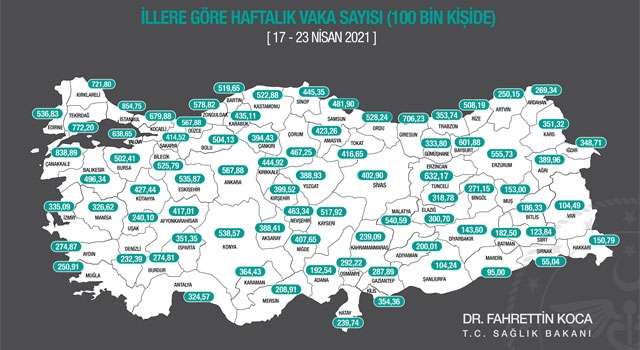 Sağlık Bakanlığı, 17-23 Nisan tarihleri arasına ait vaka haritasını açıkladı.
