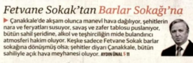 Yukarıdaki sözler, Yeni Şafak gazetesinin Aydın Ünal isimli yazarının 13 Ekim 2025 tarihli, “Fetvane Sokak’tan Barlar Sokağı’na” isimli köşe yazısında geçiyor.